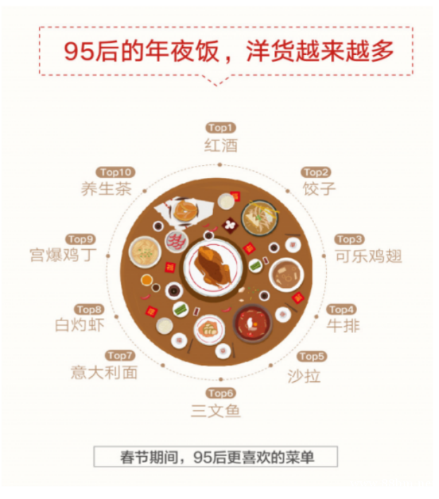 过去中国传统习俗,过年一定要吃饺子,吃鱼,吃肉.....而现在春节的餐桌已经发生了巨大的变化。从2017年到2020年的数据分析可以看到,舌尖呈现全球化的趋势。而在95后的年夜饭中,洋货越来越受欢迎,牛排、沙拉、意大利面等“国外美食”进入国门,成为传统节日中的一道另类景色。